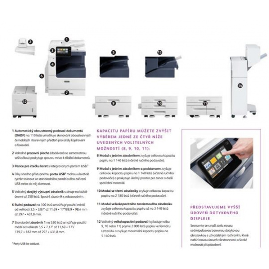 - B) Voliteľné: Dvojitý výstupný zásobník pre ofset6: po 250 hárkov, spodný zásobník s ofsetom. Integrovaný kancelársky finišer: zásobník na 500 listov, zošívanie na 50 listov, dvojpolohové zošívanie. Kancelársky finišer: stohovací zásobník na 2 000 listov, zošívanie na 50 listov, trojbodové zošívanie, voliteľné dierovanie, voliteľné viazanie brožúr (skladanie, väzba V1). Ručná zošívačka s pracovnou plochou: zošije až 50 listov