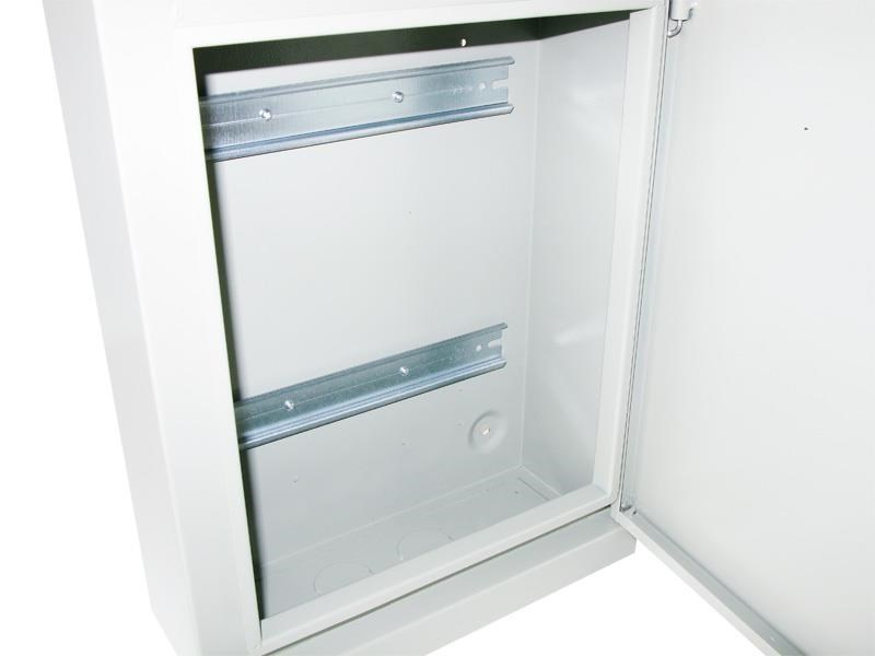 Kovová rozvodná skriňa pre vnútorné inštalácie s DIN lištou. Skrinka je vybavená kovovým zámkom a vetracími otvormi.