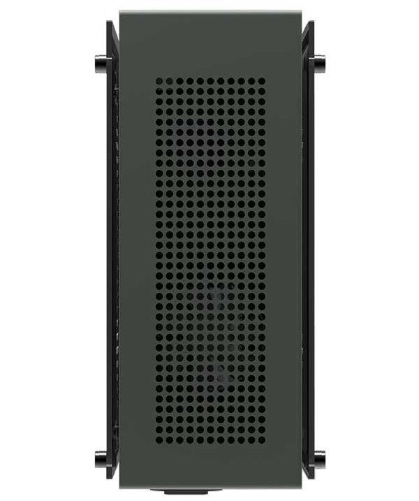 Štýlová skriňa Mini ITX s bočnicami z akrylového skla ponúka dve 2,5" pozície pre SSD. Na prednej strane sa nachádza jedno rozhranie USB 3.0 a jeden port USB typu C. V skrini je dostatok miesta pre chladič procesora s výškou až 60 mm a grafickú kartu s dĺžkou 295 mm. Horný panel je možné vybaviť jedným 80 mm ventilátorom (nie je súčasťou dodávky). Všadeprítomná perforácia zabezpečuje dostatočné prúdenie vzduchu, a tým aj účinné chladenie. Skriňa sa dodáva bez napájania.