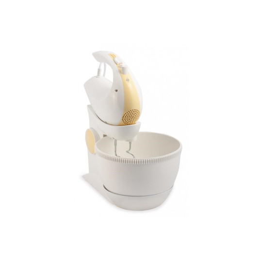 Elektrický ručný šľahač s otočnou nádobou, 5 rýchlostí a funkciou TURBO pre maximálny výkon, 2,5 l otočná nádoba s mechanickým pohonom, Sada šľahacích metiel a metiel na hnetenie, Výklopné rameno, Napájanie: 230V~ 50Hz, 300 W